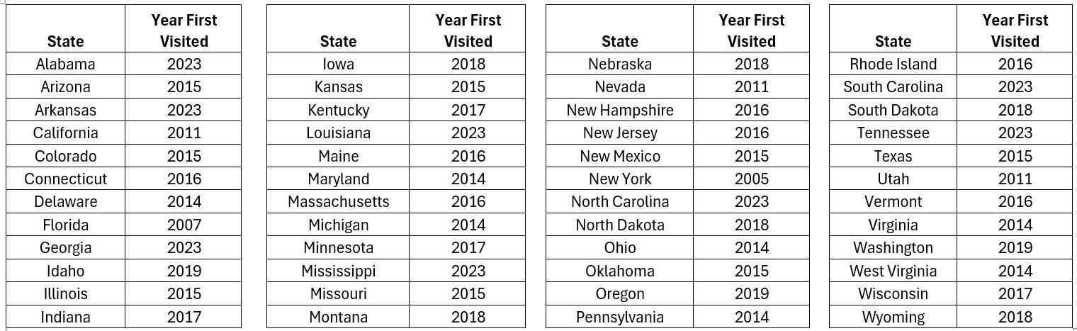 I mentioned previously that I have visited 49/50 of the US States with only Hawaii and Alaska remaining to visit. Below is a summary of when I visited each state + Hawaii in 2025!